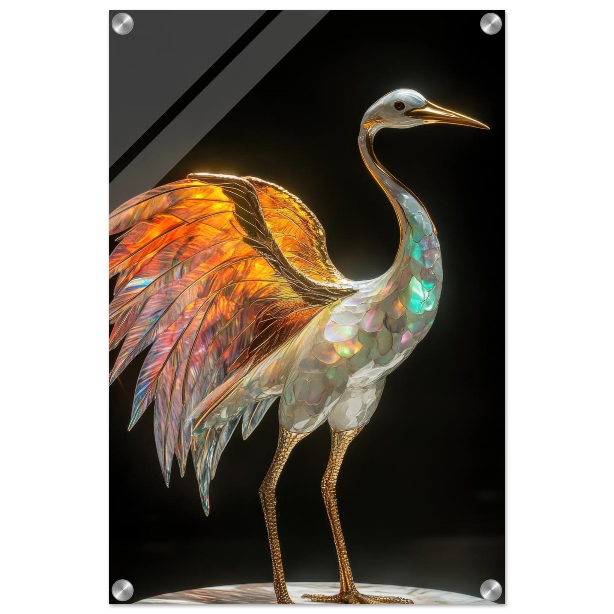 Ein mythischer Kranich mit länglichen Flügeln aus goldenem Feueropal